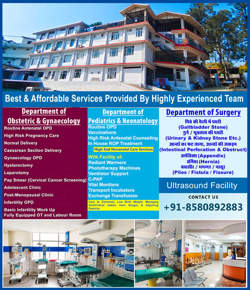 Looking into the need for best mother & child care hospital in this area The Palampur Rotary Eye Foundation decided to establish Women & Child Care Hospital in this area. 7th April 2014 was the day when this hospital was dedicated to the community. Since then the Hospital has been making healthcare accessible to one and all and committed to providing expert medical care. Having established a firm presence as a trusted name in Hospitals, it is renowned for offering specialised services and treatments. The doctor and team offer best care and guidance, always putting their patients first. The hospital is well equipped with neonatology department, latest ultrasound and laparo-scopic equipment.